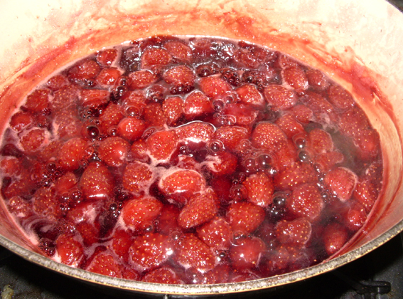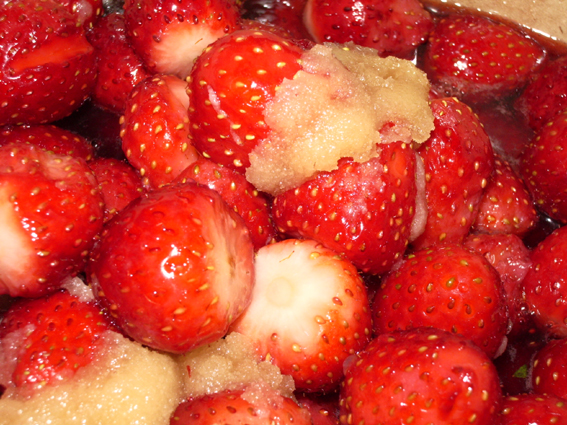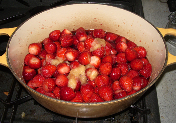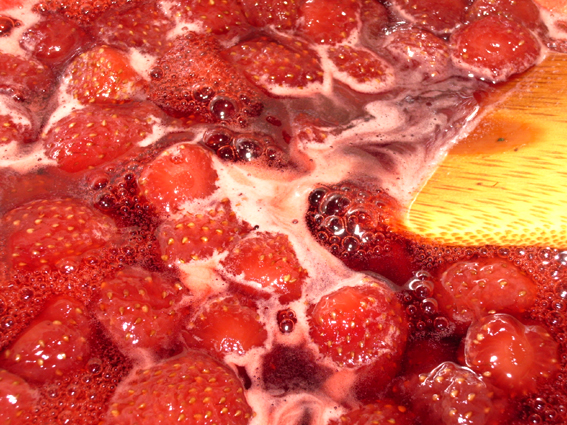今年も路地のいちごが色付いて出回ってまいりましたので、早速4パックほど買ってジャム作りを始めるお友達(と、それを撮るワタクシ)。